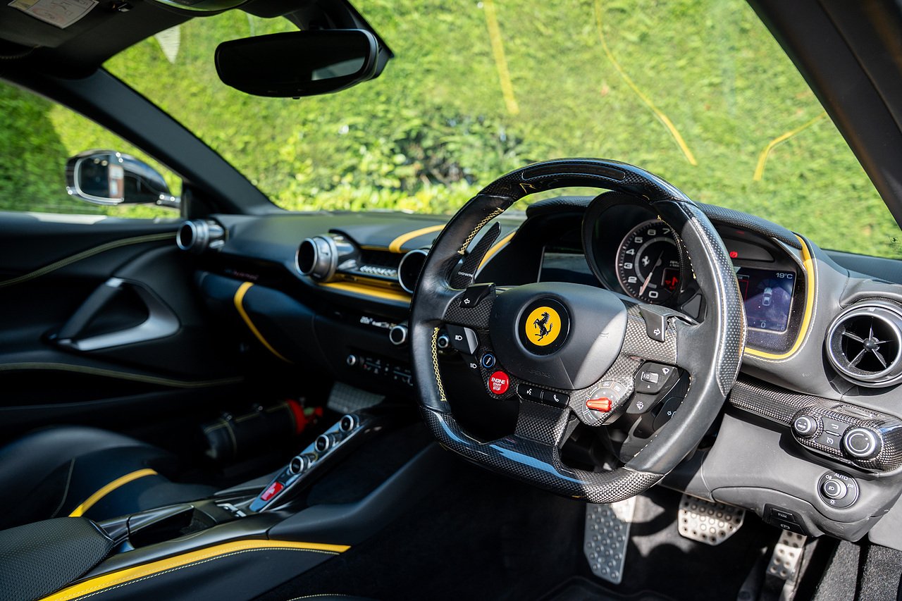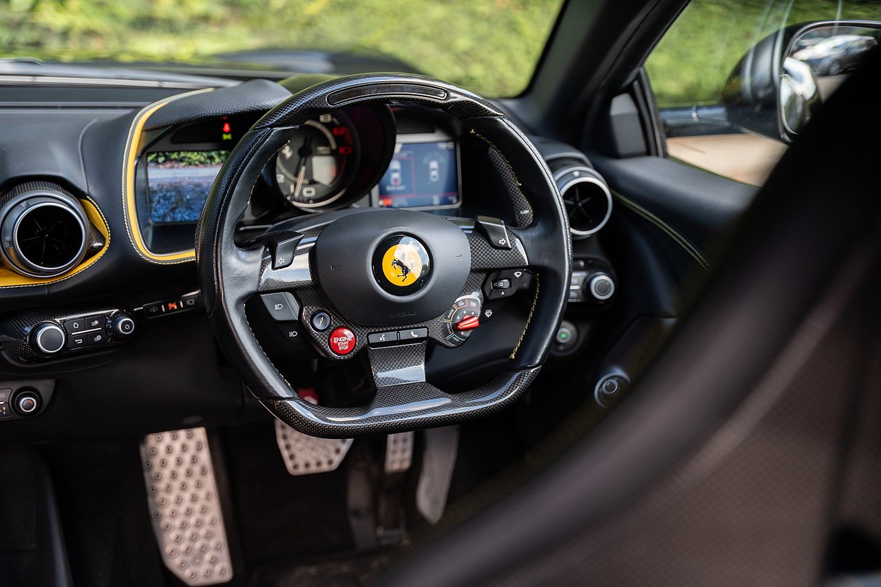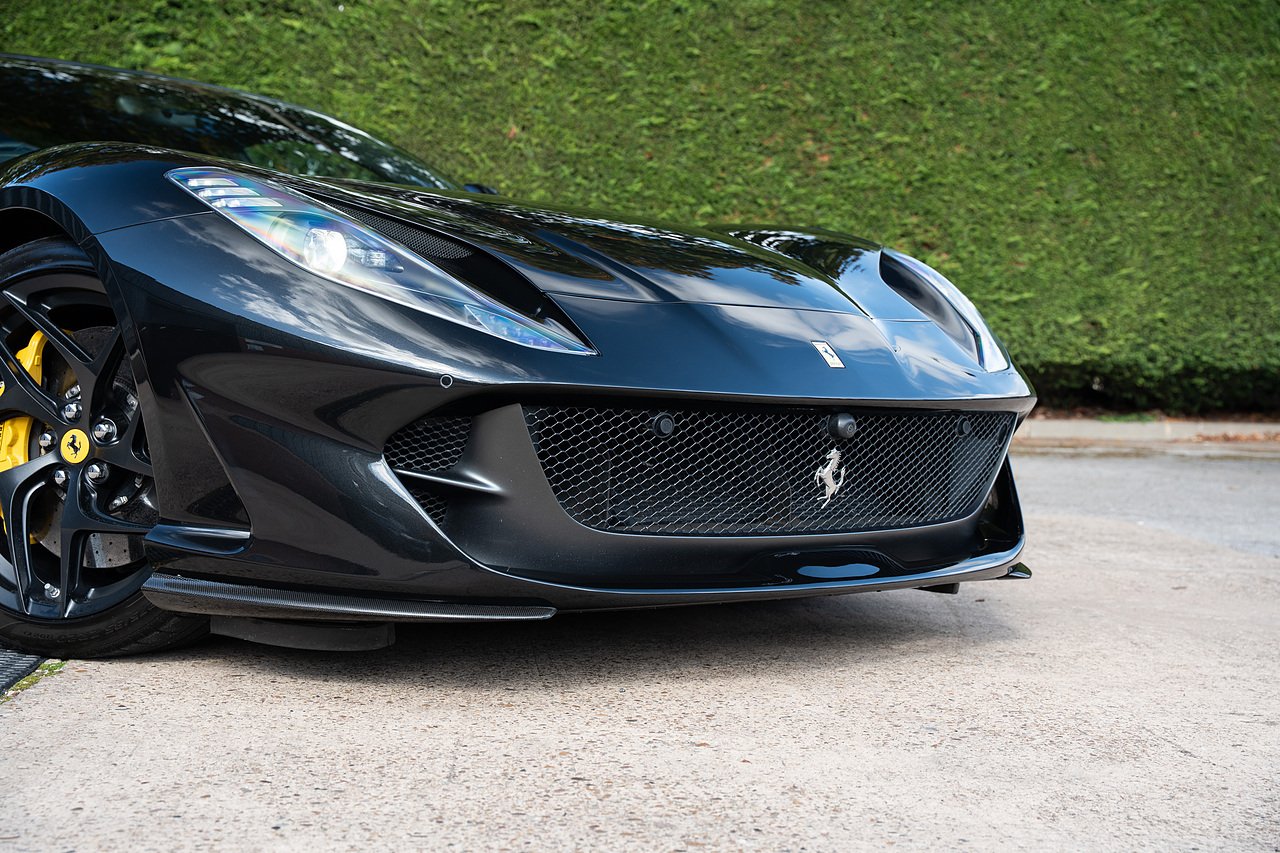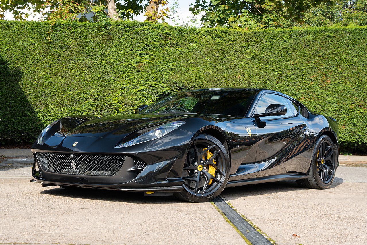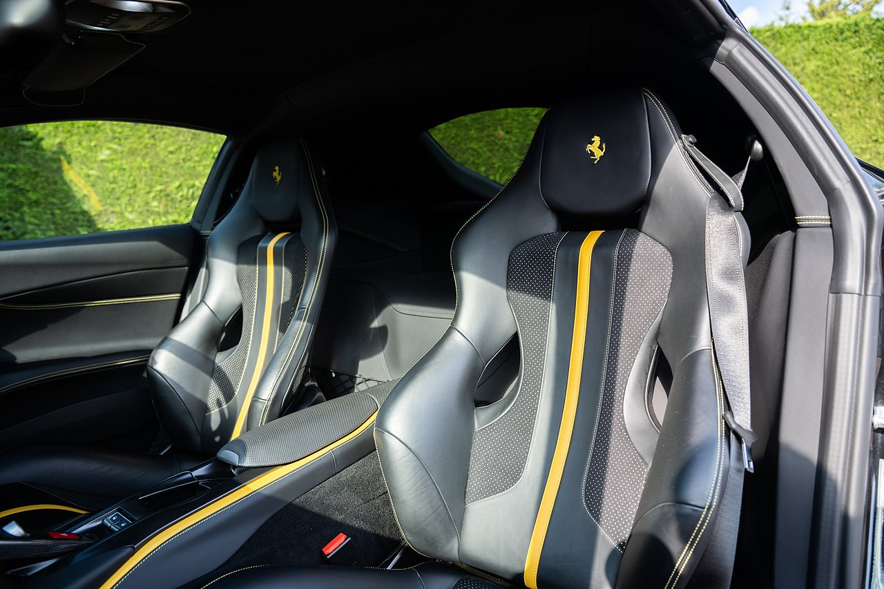Stunning Ferrari 812 just arrived into stock, finished in black metallic paint with black leather interior and yellow contrast details. Specification includes suspension lift system, JBL sound system, carbon fibre racing seats, carbon fibre front spoiler, carbon fibre rear diffuser, carbon fibre steering wheel with LEDs, carbon fibre central bridge, exterior sill kicks in carbon, dash inserts in carbon, black tailpipe tips, fire extinguisher, rear view camera, front and rear parking sensors, gloss yellow brake calipers, 20" forged alloy wheels, rear privacy glass, cavallino stitched on headrest, scuderia shields on wings, and much more