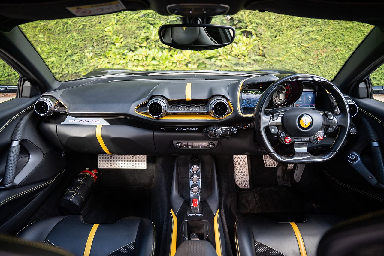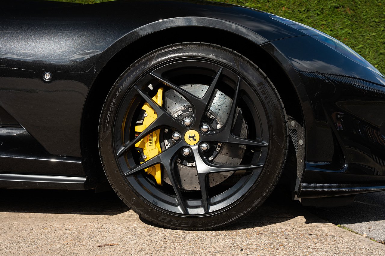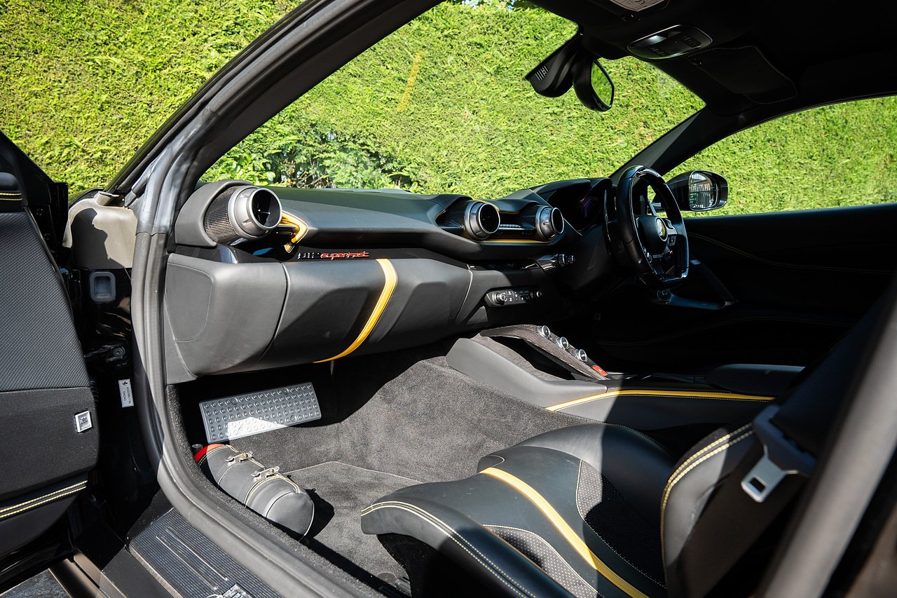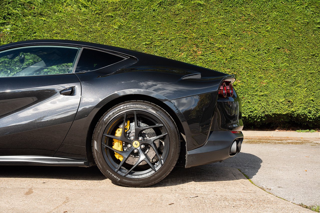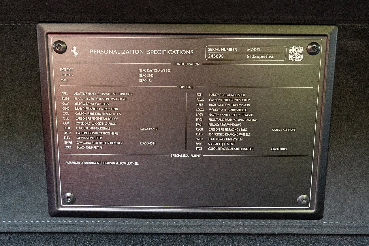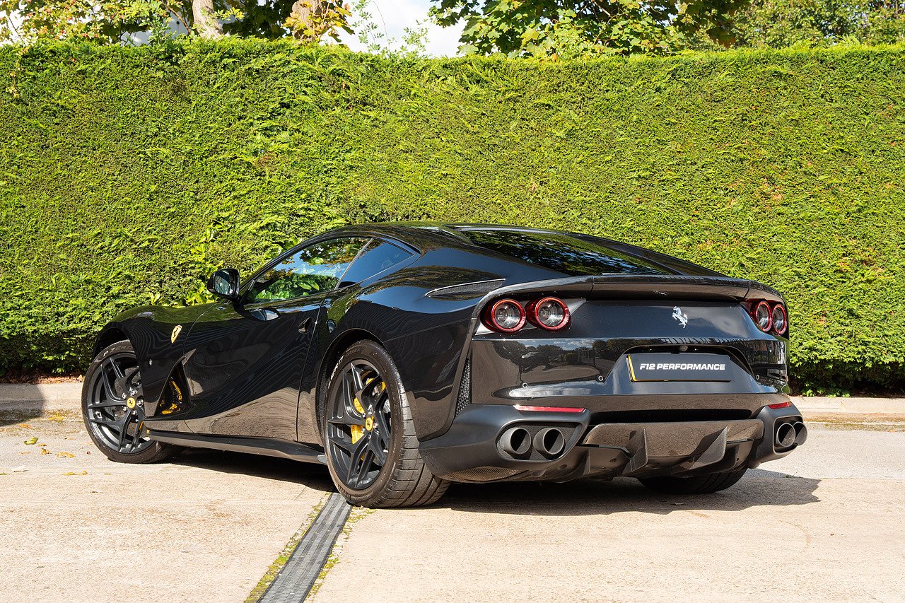 Stunning Ferrari 812 just arrived into stock, finished in black metallic paint with black leather interior and yellow contrast details. Specification includes suspension lift system, JBL sound system, carbon fibre racing seats, carbon fibre front spoiler, carbon fibre rear diffuser, carbon fibre steering wheel with LEDs, carbon fibre central bridge, exterior sill kicks in carbon, dash inserts in carbon, black tailpipe tips, fire extinguisher, rear view camera, front and rear parking sensors, gloss yellow brake calipers, 20" forged alloy wheels, rear privacy glass, cavallino stitched on headrest, scuderia shields on wings, and much more