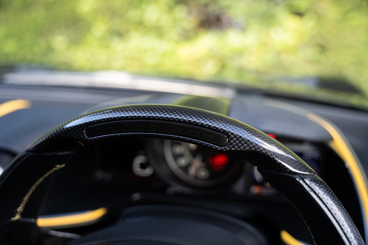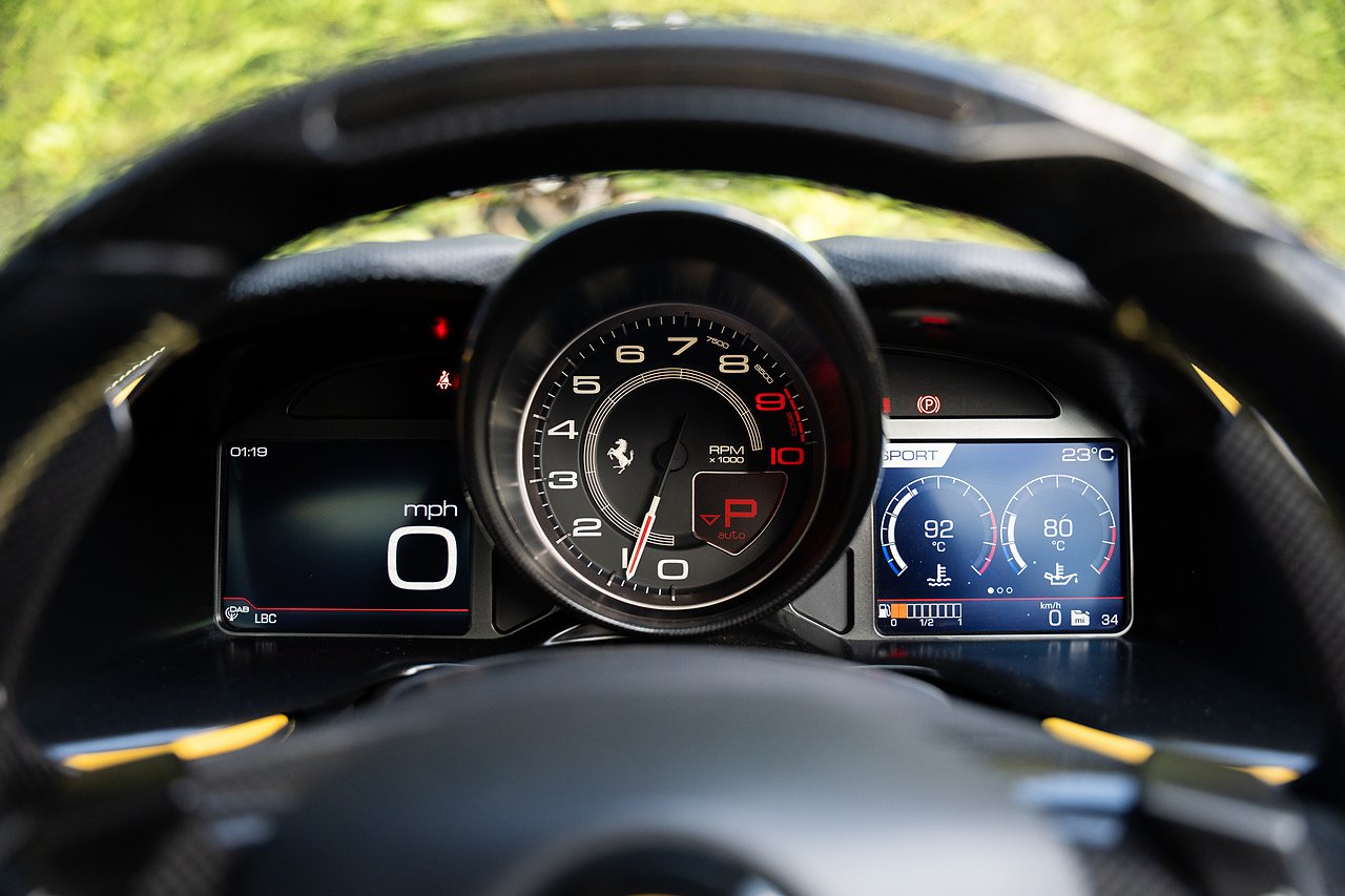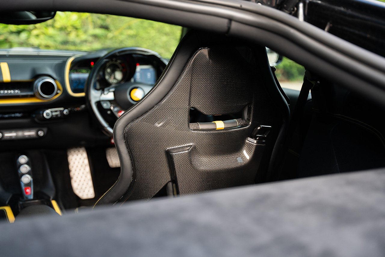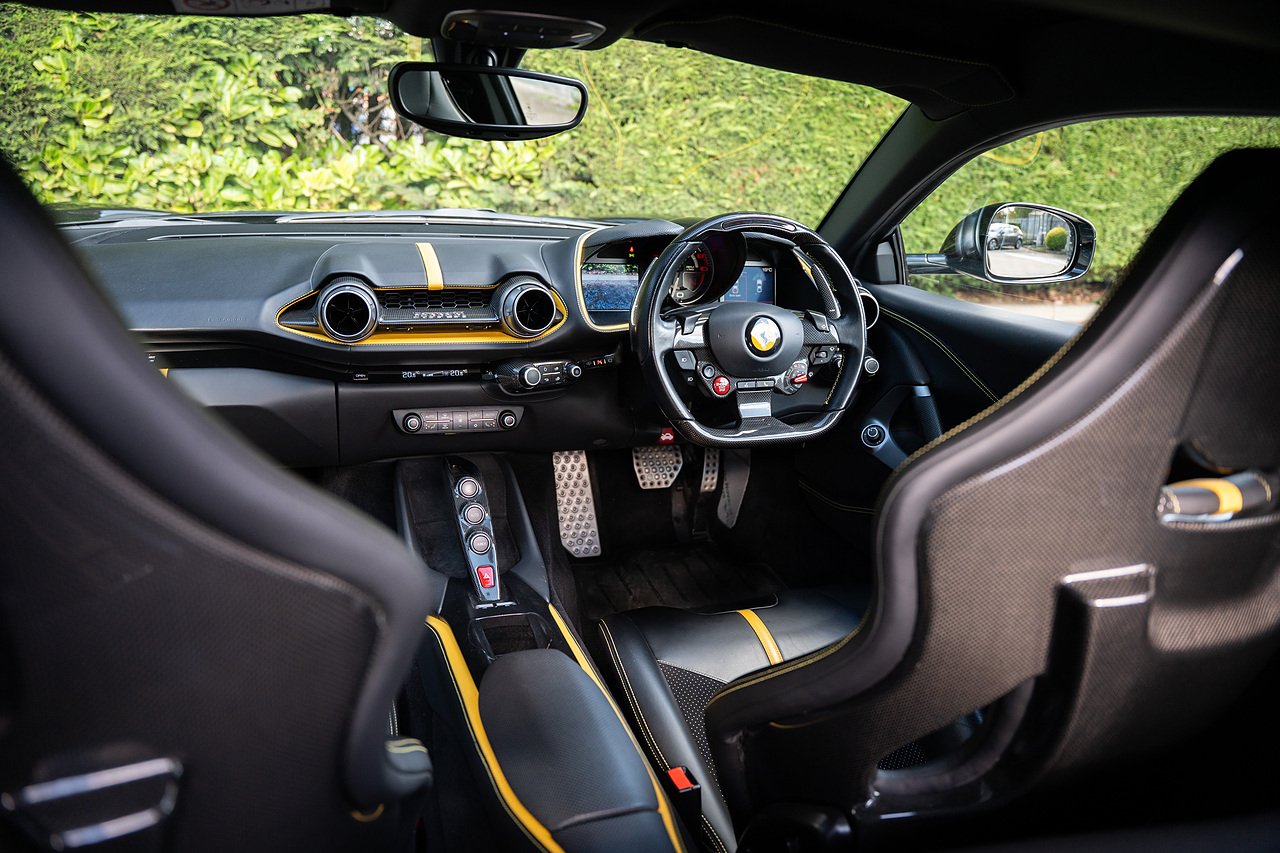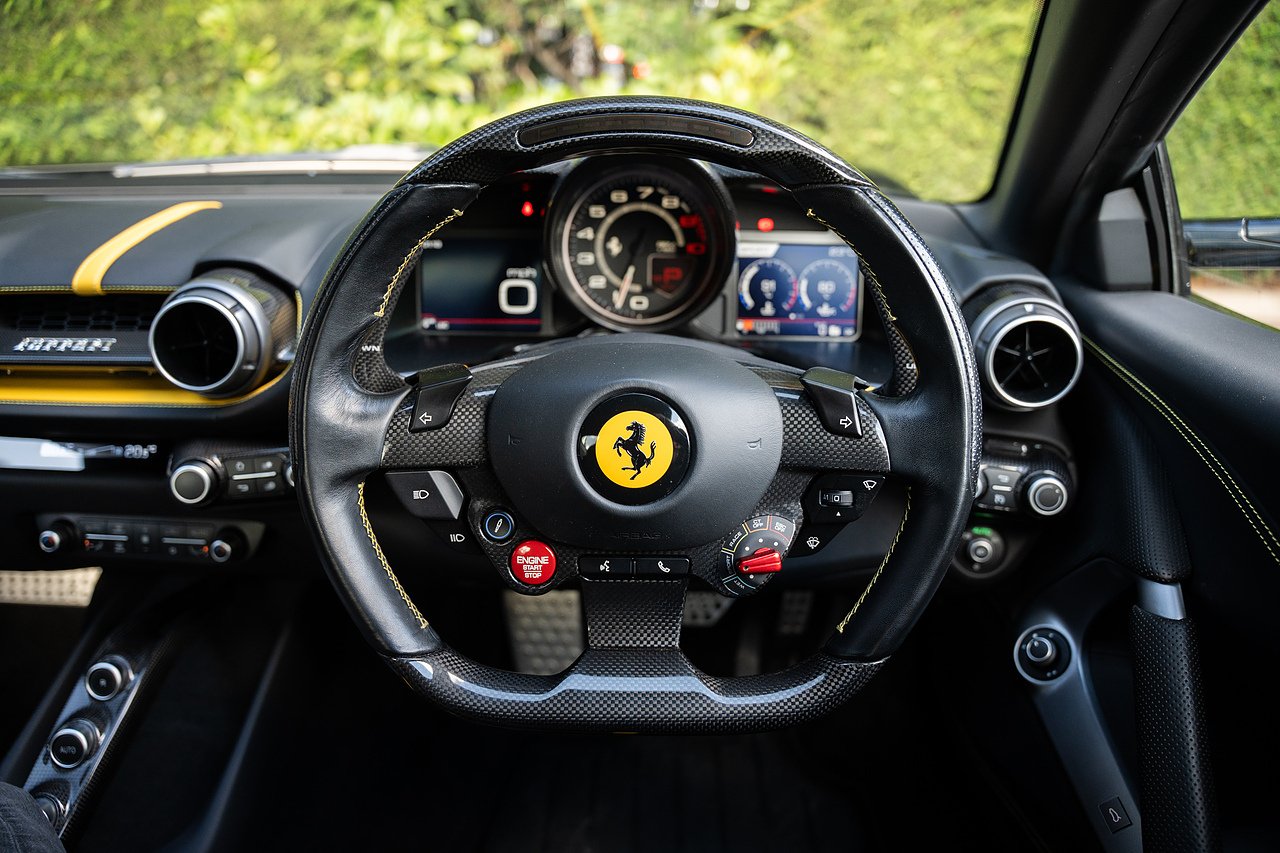 Stunning Ferrari 812 just arrived into stock, finished in black metallic paint with black leather interior and yellow contrast details. Specification includes suspension lift system, JBL sound system, carbon fibre racing seats, carbon fibre front spoiler, carbon fibre rear diffuser, carbon fibre steering wheel with LEDs, carbon fibre central bridge, exterior sill kicks in carbon, dash inserts in carbon, black tailpipe tips, fire extinguisher, rear view camera, front and rear parking sensors, gloss yellow brake calipers, 20" forged alloy wheels, rear privacy glass, cavallino stitched on headrest, scuderia shields on wings, and much more