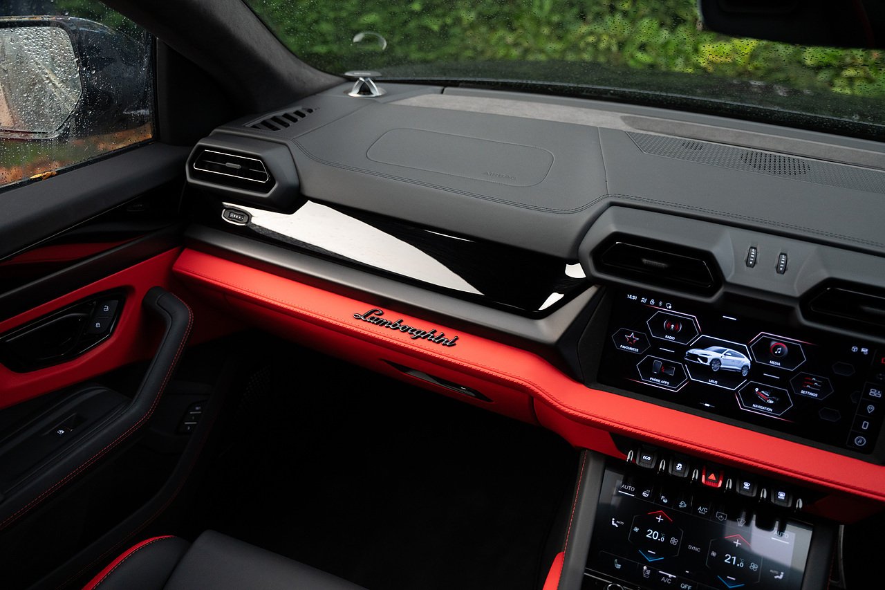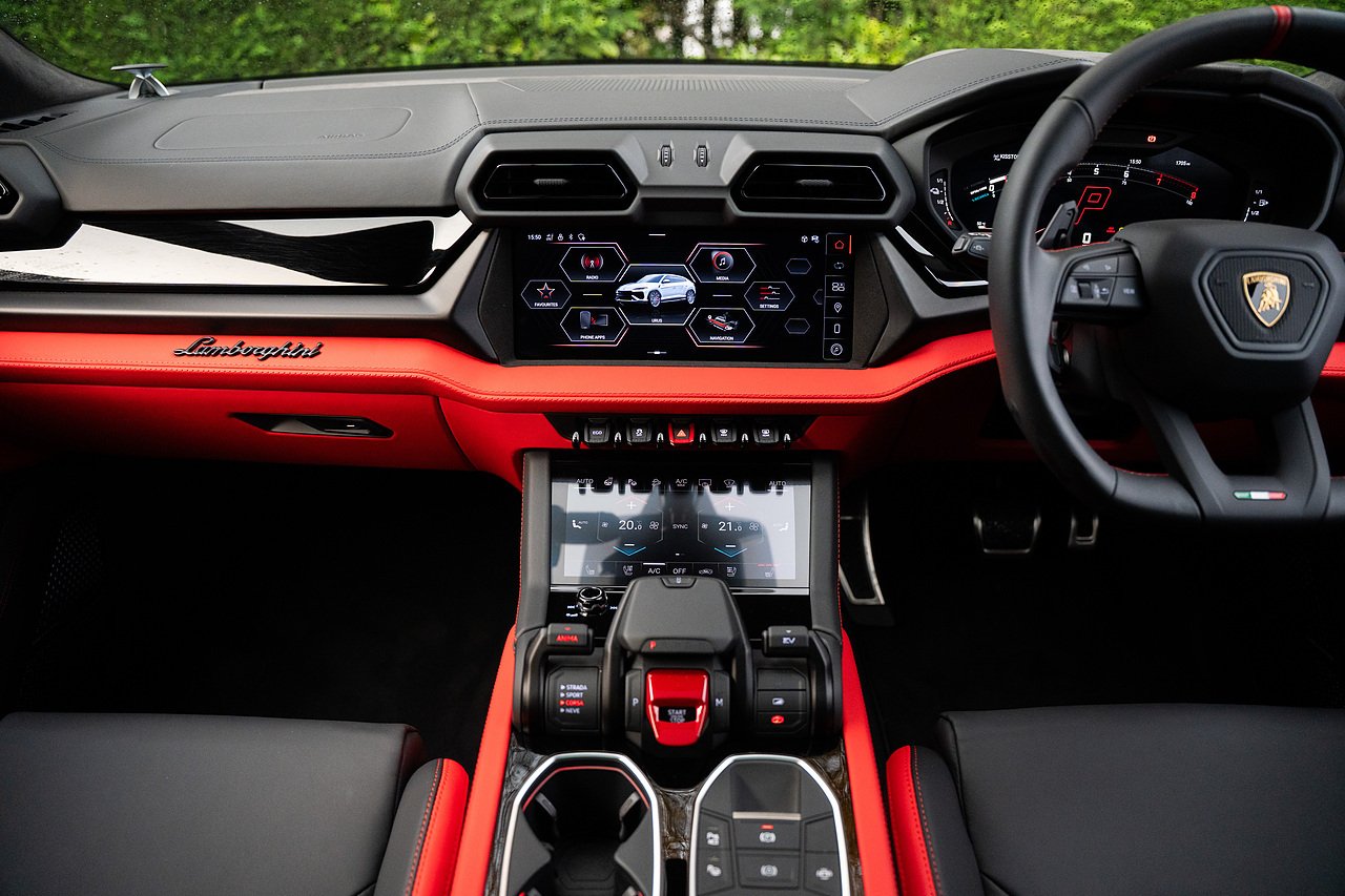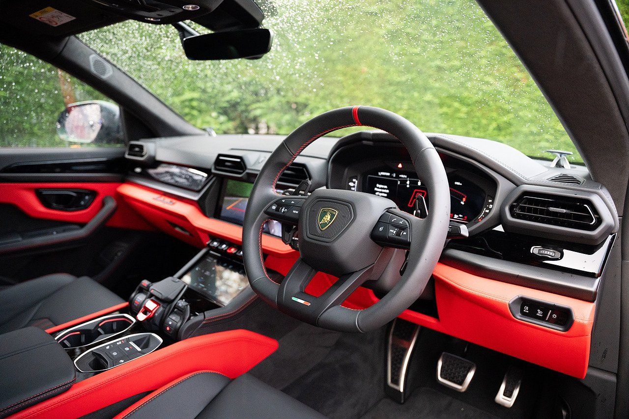 Stunning Lamborghini Urus SE, finished in Nero Helene over black and red contrast leather interior. Full PPF in ‘Wicked Thundercloud’ black metallic with blue and purple fleck, applied by Topaz Detailing. Fantastic specification with a list price of over £270k, this includes panoramic glass sliding roof, Bang & Olufsen advanced 3D audio system, 23" Galanthus alloy wheels with diamond cut finish, full high gloss black style package, performante trim on leather seats, ambient light package, sport heated steering wheel with contrast stitching, gloss red brake calipers, matt black exhaust tailpipes, Lamborghini ANIMA with off road modes, black anodised treatment for aluminium inserts, heated front and rear seats, and much more