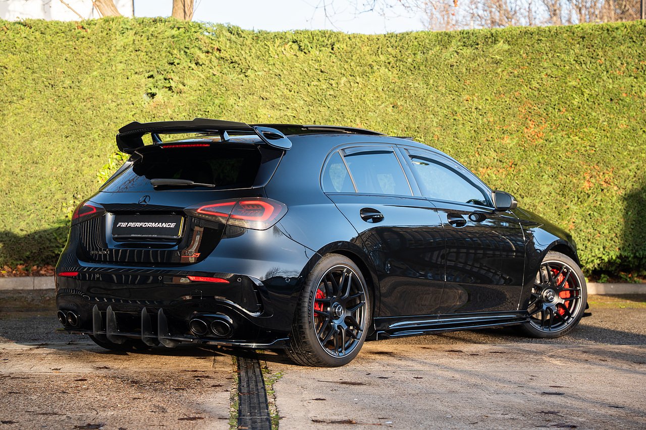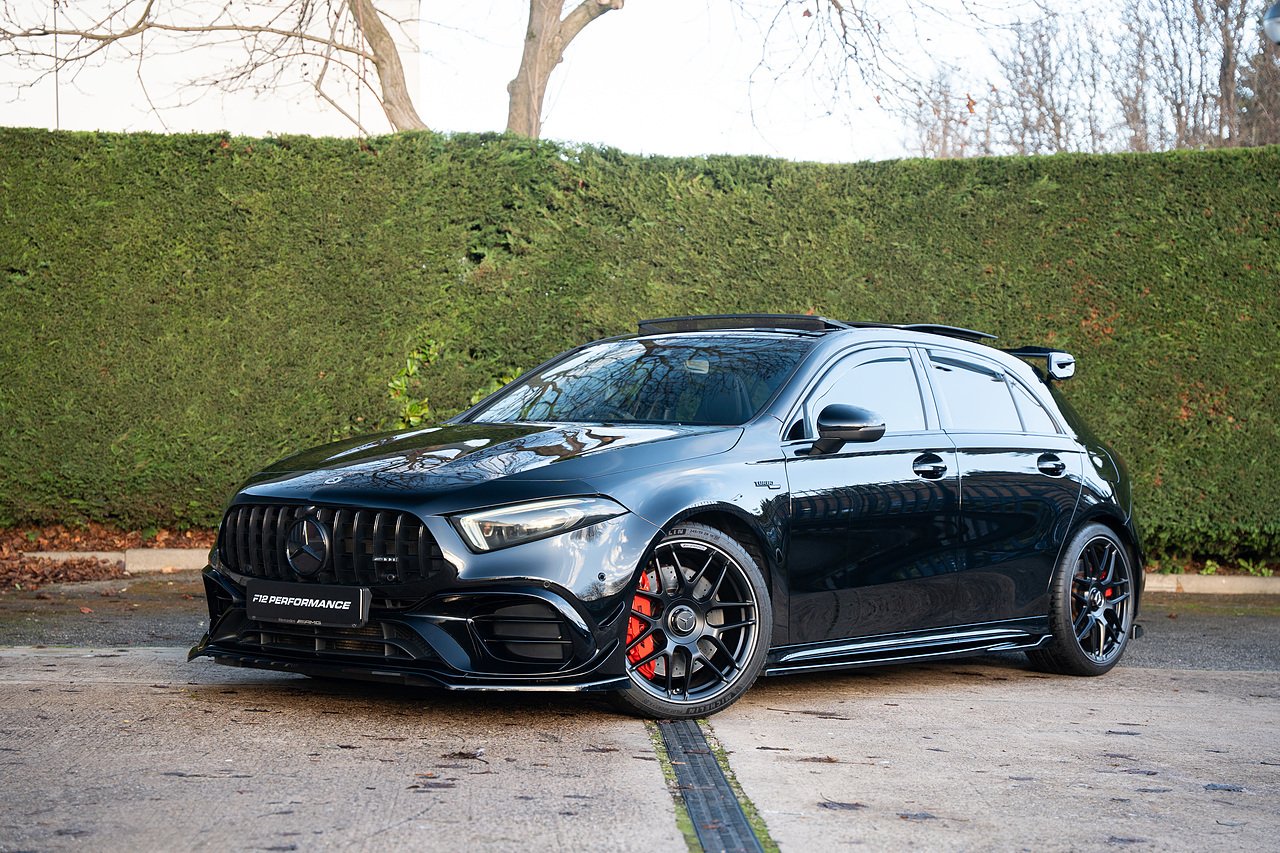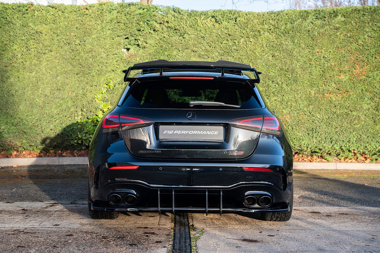 Fantastic Mercedes-Benz A45 S Plus, finished in black metallic paint with full PPF protection, featuring starlight headlining with colour control app, maxton gloss black aero kit, panoramic glass sliding roof, heated front seats, switchable sports exhaust system, reversing camera, surround parking sensors, cruise control, ambient lighting, bluetooth connectivity, satellite navigation and more