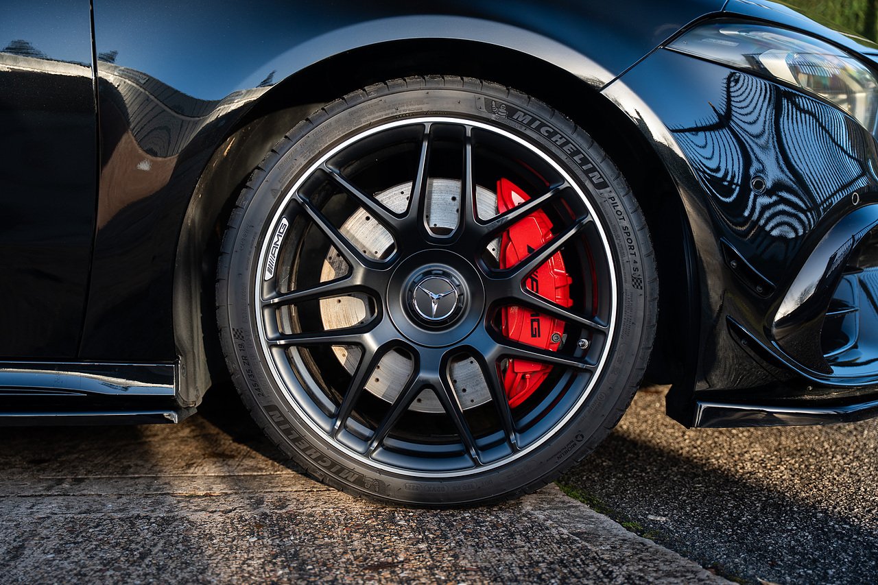 • AMG High-Performance Braking System with Red Brake Calipers and Black AMG Lettering at the Front